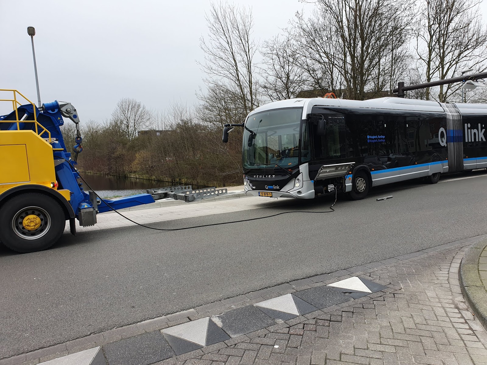 Halverwege de middag zag deze blogger bij de Wibena-rotonde, daar waar zes weken geleden een oplaadstation voor elektrische bussen is gekomen, een gele wagen van een takel- en bergingsbedrijf uit Hoogkerk voor en een achter een Qbuzz staan.