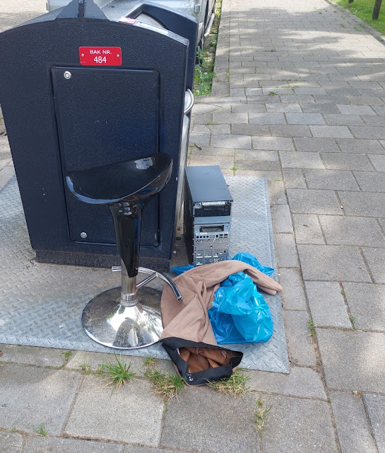 Foto boven is afgelopen zondag gemaakt, dit blogbericht lag al klaar, zie verder beneden. Twee dames hadden zojuist de blauwe zakken met troep neergezet. Rechts ziet u nog een vertrekkende been en voet.